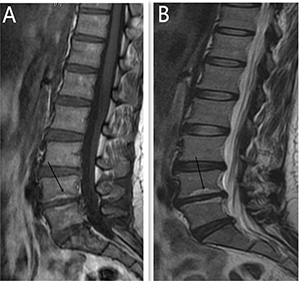 Figure 3: Modic type 2 changes was presented by MR for a 46 year old women, diagnosed with discogenic LBP for 10 months. (A) is High T1 signal (L4-5). (B) indicates High T2 signal (L4-5).