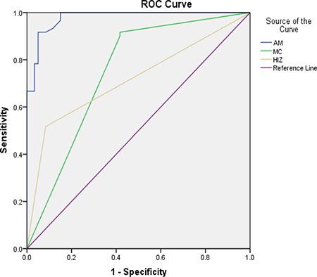 Figure 5: The ROC curve for the diagnosis of discogenic LBP. AM: Angular motion, MC: Modic change, HIZ: high intense zone.