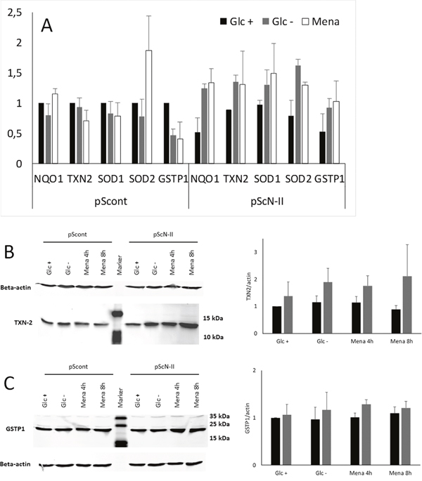 This increase in gene expression was confirmed at the protein level for TXN2 but not for GSTP1 after an 8 hour incubation in the absence of glucose (Figure 7B). Indeed, still no difference was observed when cells were cultured in presence of glucose, but TXN2 expression increased 2-fold in pScN-II cells cultured in absence of glucose. Again, similar results were obtained with exposure to menadione.