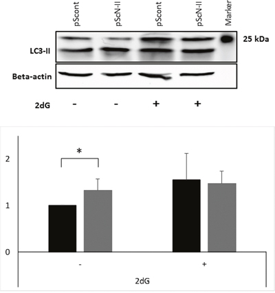 Figure 8: Protein expression of LC3-II (size 17 kDa) and beta-actin (size 42 kDa) in MDA-MB-231-pScont and -pScN-II cells cultured in normal media or exposed 16 hours to 2-deoxyglucose. The gel shows result from a representative experiment and the graph shows the mean values ± standard deviation of the quantification of bands obtained in four independent experiments. *: p<0.005 with Student’s t-test.