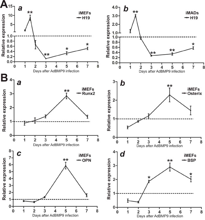 Figure 1: Expression levels of lncRNA H19 and osteogenic markers in BMP9-induced osteogenic differentiation of MSCs. Exponentially growing iMEFs or iMADs were infected with AdBMP9 or AdGFP. At the indicated time points, total RNA was isolated and subjected to TqPCR analysis using PCR primers specific for mouse H19 (A) and other osteogenic markers (B). All samples were normalized with the reference gene Gapdh. Each assay condition was done in triplicate. Relative expression was calculated by dividing the relative expression values (i.e., gene/Gapdh) in BMP9-treated group with that from the GFP group. “**” p < 0.001, “*” p < 0.05, AdBMP9 group vs. AdGFP group. Runx2, runt-related transcription factor 2; OPN, osteopontin; BSP, bone sialoprotein.