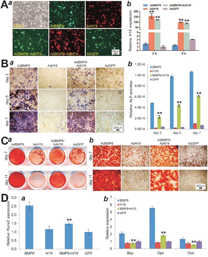 Figure 3: Overexpression of lncRNA H19 blocks BMP9-induced osteogenic differentiation of MSCs in vitro. (A) Adenovirus AdH19-mediated overexpression of mouse H19. (a) AdH19 transduces iMEF cells with high efficiency. (b) AdH19 increases the expression of H19 more than 50 times at day 2 and day 5. All samples were normalized with the reference gene Gapdh. Each assay condition was done in triplicate. “**” p < 0.001, AdH19 group vs. AdGFP group. (B) Overexpression of H19 inhibits BMP9-induced ALP activity in MSCs. Subconfluent iMEFs were infected with AdBMP9 or AdGFP and/or AdH19. At the indicated time points, the infected cells were subjected to ALP activity assays by either histochemical staining (a) or quantitative bioluminescence assay (b). Each assay condition was done in triplicate. Representative staining is shown. “**” p < 0.001, AdBMP9 group vs. AdBMP9+AdH19 group. (C) Overexpression of H19 inhibits BMP9-induced calcium deposit. Subconfluent iMEFs were infected with AdBMP9 or AdGFP and/or AdH19, and cultured in mineralization medium. At the indicated time points, the infected cells were fixed and subjected to Alizarin Red S staining. Each assay condition was done in triplicate. Representative gross images (a) and microscopic images (20x) (b) are shown. (D) Overexpression of H19 inhibits BMP9-induced early osteogenic regulator Runx2 at day 3 (a) and late osteogenic differentiation marker Bsp, Opn and Ocn at day 5 (b). “**” p < 0.001, AdBMP9 group vs. AdBMP9+AdH19 group.