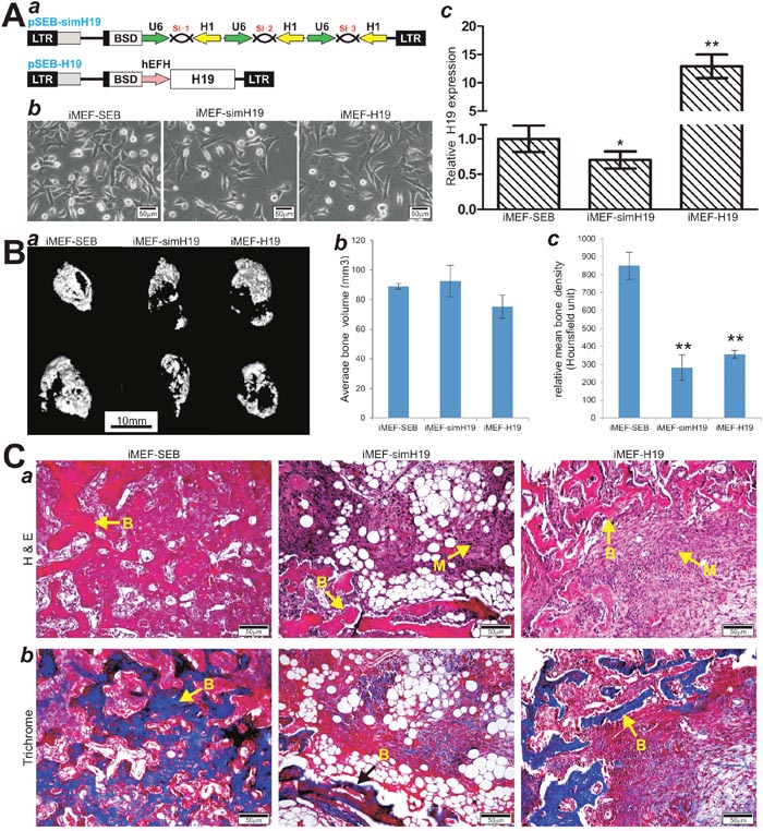 Figure 4: Stable overexpression and silencing of lncRNA H19 inhibit BMP9-induced ectopic bone formation in vivo. (A) Stable expression of mouse H19 or siRNAs silencing H19 in MSCs. (a) Schematic representation of the retroviral vectors expressing siRNAs targeting mouse H19 or the full-length transcript of mouse H19 (a). The retroviral vectors also express blasticidin resistance gene. (b) The stable iMEFs lines that express simH19 (iMEF-simH19), mouse H19 (iMEF-H19), or empty vector (iMEF-SEB). (c) The expression levels of H19 in the three stable lines were assessed by TqPCR, “*” p < 0.05, iMEF-SEB group vs. iMEF-simH19 group; “**”, p < 0.001 iMEF-SEB group vs. iMEF-H19 group. (B) μCT imaging of the BMP9-induced ectopic bone formation of the three stable lines. (a) μCT imaging and 3D reconstruction of the retrieved bone masses from the indicated groups at 4 weeks (a). No significant volumetric differences were found among the three groups (b) (p>0.05). Mean bone density was analyzed in each group. “**” p < 0.001, iMEF-SEB group vs. iMEF-simH19 or iMEF-H19 group. (C) H & E (a) and Masson’s Trichrome staining (b) of the bone masses retrieved at week 4. Representative images are shown. (B) mature bone; M, undifferentiated MSCs.