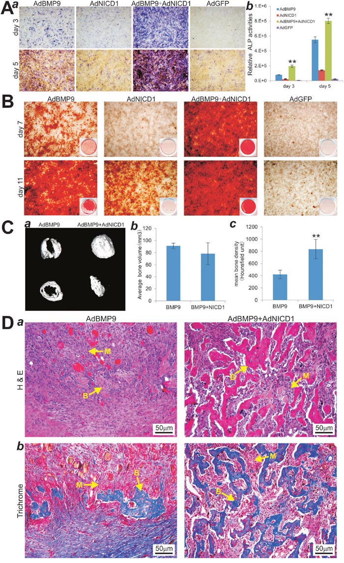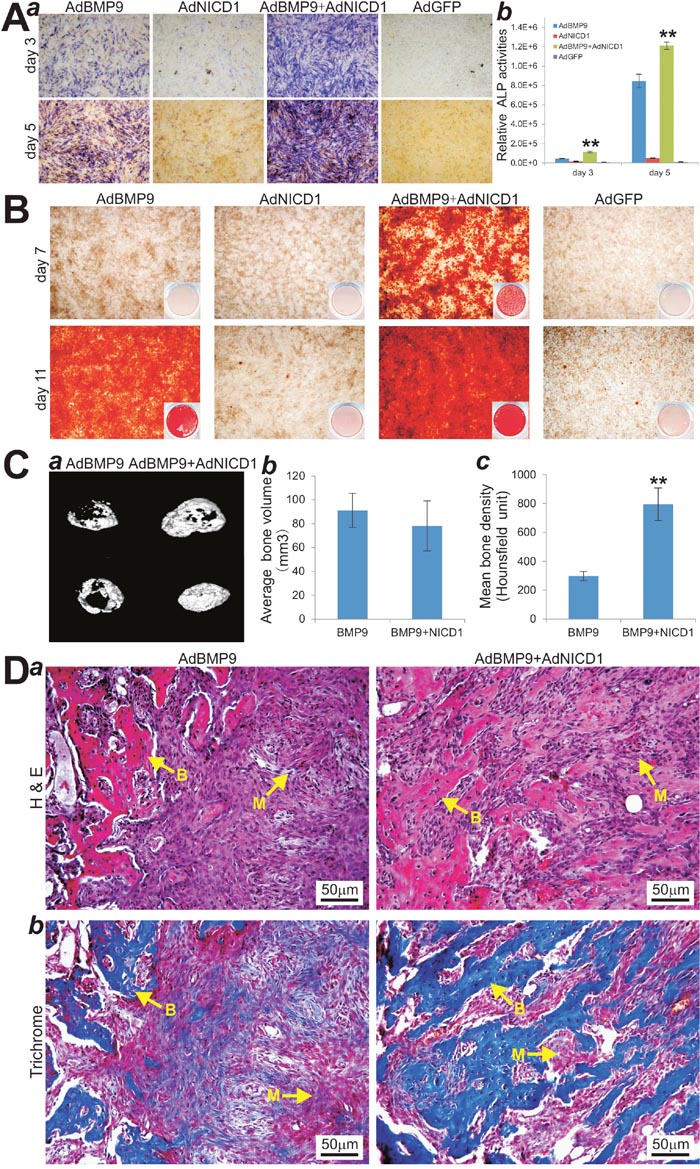 Figure 5: Activation of Notch signaling through exogenous expression of Notch1 introcellular domain (NICD1) restores BMP9-induced osteogenic differentiation in iMEF-simH19 cells. (A) AdNICD1-mediated expression of NICD1 in iMEF-simH19 cells rescues BMP9-induced ALP activity. Subconfluent iMEF-simH19 cells were infected with AdBMP9, AdNICD1, AdBMP9+AdNCID1 or AdGFP. At the indicated time points ALP activity was determined by qualitative histochemical staining (a) and quantitative bioluminescence assay (b). “**” p < 0.001, AdBMP9 group vs. AdBMP9+AdNICD1 group. (B) NICD1 expression rescues down-regulated calcium deposit in iMEF-simH19 cells. Subconfluent iMEF-simH19 cells were infected with AdBMP9, AdNICD1, AdBMP9+AdNCID1 or AdGFP, and cultured in mineralization medium. At the indicated time points, the infected cells were fixed and subjected to Alizarin Red S staining. Each assay condition was done in triplicate. Representative gross images (a) and microscopic images (20x) (b) are shown. (C) μCT imaging of the BMP9-induced ectopic bone formation in iMEF-simH19 cells that were infected with AdBMP9 or AdBMP9+AdNICD1. (a) μCT imaging and 3D reconstruction of the retrieved bone masses from the indicated groups at 4 weeks (a). No significant volumetric differences were found among the three groups (b) (p>0.05). Mean bone density was analyzed in each group. “**” p < 0.001, AdBMP9 group vs. AdBMP9+AdNICD1 group. (D) H & E (a) and Masson’s Trichrome staining (b) of the bone masses retrieved at week 4. Representative images are shown. B, mature bone; M, undifferentiated MSCs.