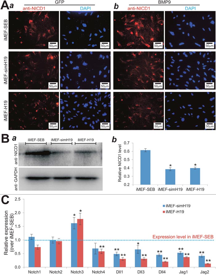 To understand how H19 may influence Notch signaling in MSCs, we examined whether BMP9-induced activation of Notch signaling was impaired when H19 was silenced or overexpressed. Consistent with our earlier findings [55], BMP9 stimulation induced cytoplasmic/nuclear accumulation of NICD in MSCs (Figure 7A, 7Aa vs. 7Ab). However, the BMP9-induced NICD accumulation was significantly diminished both in H19 silenced MSCs (iMEF-simH19) and H19 overexpressing MSCs (iMEF-H19) (Figure 7A, 7Aa vs. 7Ab). These results were further confirmed by Western blotting analysis, in which endogenous NICD accumulation was significantly less pronounced in both iMEF-simH19 and iMEF-H19 cells, compared with that of the iMEF-SEB cells (Figure 7B–ab). Collectively, these results indicate that lncRNA H19 may influence BMP9 signaling in MSCs by regulating Notch signaling.