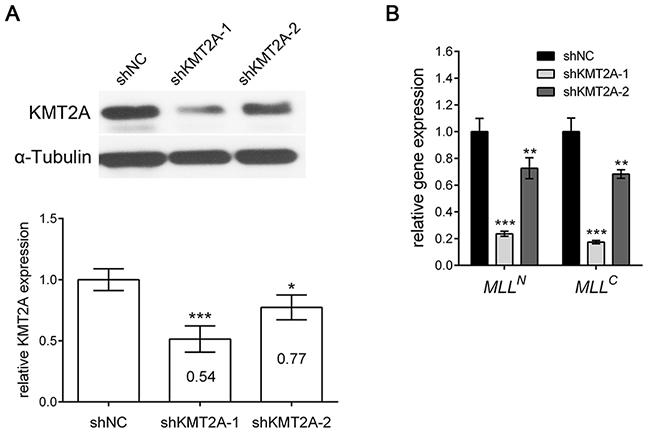 Figure 1: shKMT2A effectively downregulates KMT2A expression. shKMT2A downregulates the expression of KMT2A in U-87 MG cells. (A) Western blot analysis indicated that KMT2A expression was inhibited by shKMT2A-1 and shKMT2A-2, and the result was quantified. shKMT2A-1 was more efficient than shKMT2A-2. (B) RT-PCR demonstrated that shKMT2A inhibits the expression of MLLN and MLLC. *, p < 0.05; **, p < 0.01; ***, p < 0.001.