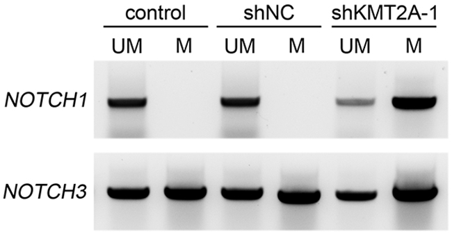 The CXXC domain in KMT2A binds to unmethylated CpG islands and protects CpG clusters within target genes from methylation [4–6]. CpG DNA methylation of NOTCH promoters contributes to decreased NOTCH expression [18–20]. To further confirm the direct regulation of KMT2A in NOTCH1 and NOTCH3, we used methylation-specific PCR (MSP), and the result revealed that the CpG islands in NOTCH1 and NOTCH3 promoters were unmethylated (Figure 4). In addition, the signaling observed for methylated NOTCH1 and NOTCH3 significantly increased upon KMT2A knockdown (Figure 4). This result indicates that KMT2A induces or maintains NOTCH1 and NOTCH3 expression by protecting NOTCH1 and NOTCH3 from DNA methylation.