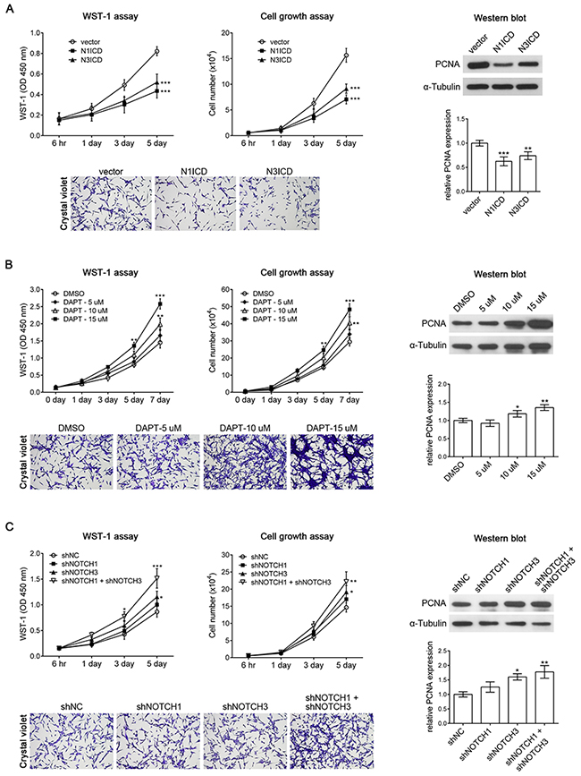 Figure 5: NOTCH1 and NOTCH3 suppresses U-87 MG cell proliferation. (A) The result of the WST-1 assay, cell growth assay, and Western blot analysis with PCNA antibody revealed that overexpressing the constitutively active form of NOTCH1 (N1ICD) or NOTCH3 (N3ICD) inhibited U-87 MG cell proliferation. (B) U-87 MG cells treated with the NOTCH signaling inhibitor DAPT exhibited increased cell proliferation in a dose-dependent manner. DMSO was used as a control. (C) The WST-1 assay, cell growth assay, and Western blot analysis with PCNA antibody demonstrated that shNOTCH1 had no effect on U-87 MG cell proliferation, shNOTCH3 slightly induced U-87 MG cell proliferation, and double transfection of shNOTCH1 and shNOTCH3 exhibited significant induction of U-87 MG cell proliferation. *, p < 0.05; **, p < 0.01; ***, p < 0.001.