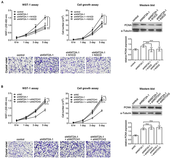 Figure 6: N1ICD abolishes the KMT2A knockdown effect. (A) KMT2A knockdown-induced cell proliferation was recovered using N1ICD or N3ICD, as determined by the WST-1 assay, cell growth assay, and Western blot analysis with PCNA antibody in U-87 MG cells. (B) shNOTCH1 or shNOTCH3 in shKMT2A-transfected U-87 MG cells did not further induce U-87 MG cell proliferation, compared with the effect of shKMT2A. n.s., not significant; *, p < 0.05; **, p < 0.01; ***, p < 0.001.