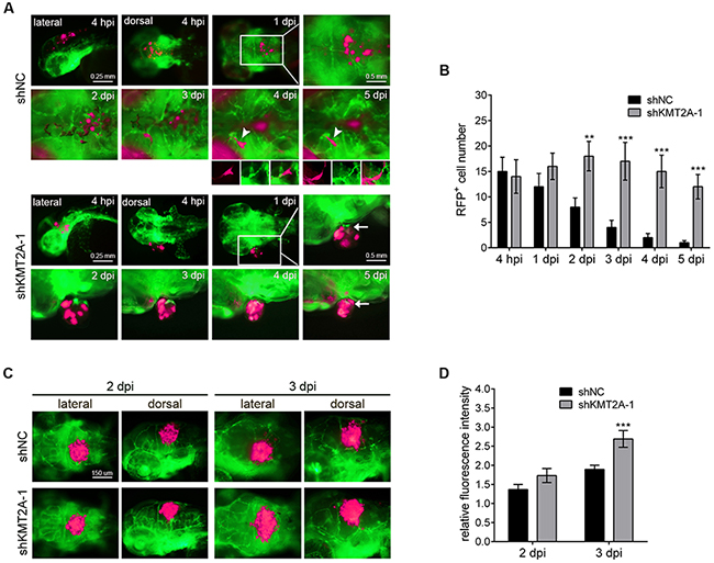 Figure 7: KMT2A knockdown promotes tumor growth in zebrafish. (A) U-87 MG cells were labeled with RFP (shown in fluorescent magenta), and approximately 50 cells were injected into the brains of Tg(fli1:egfp) fish in each experiment. Blood vessels are depicted by green fluorescent color. The transplanted zebrafish were imaged from 4 hours postimplantation (hpi) to 5 days postimplantation (dpi). Arrowheads depict tumor cells in the blood vessels, and arrows indicate the zebrafish blood vessels penetrating into the tumor tissues. (B) Quantification of transplanted cells. Quantification was performed by individually counting cells with red fluorescence (shown in fluorescent magenta), which indicated that the number of transplanted cells was significantly increased by KMT2A knockdown, compared with the control. shNC, scramble shRNA as negative control. (C) The immunosuppressant dexamethasone treatment increased the tumor growth. This result was quantified by measuring the red fluorescence intensity (D). **, p < 0.01; ***, p < 0.001.