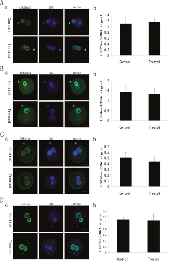 Figure 2: Histone modifications of the late 1-cell stage embryos derived from ICSI using the sperm with or without LL+P+RNases-treatment. (A) H3K27me3 in the late 1-cell stage embryos derived from ICSI using the sperm with or without treatment (n = 18). The staining pattern of H3K27me3 in the late 1-cell stage embryos derived from ICSI using the sperm with or without treatment (a) and the ratio of H3K27me3/DNA signal intensity in the late 1-cell stage embryos derived from ICSI using the sperm with or without treatment (b). H3K27me3: green; DNA: blue. Bar=20μm. (B) H3K4me3 in the late 1-cell stage embryos derived from ICSI using the sperm with or without treatment (n = 20). The staining pattern of H3K4me3 in the late 1-cell stage embryos derived from ICSI using the sperm with or without treatment (a) and the ratio of H3K4me3/DNA signal intensity in the late 1-cell stage embryos derived from ICSI using the sperm with or without treatment (b). H3K4me3: green; DNA: blue. Bar=20μm. (C) H3K14ac in the late 1-cell stage embryos derived from ICSI using the sperm with or without treatment (n = 19). The staining pattern of H3K14ac in the late 1-cell stage embryos derived from ICSI using the sperm with or without treatment (a) and the ratio of H3K14ac/DNA signal intensity in the late 1-cell stage embryos derived from ICSI using the sperm with or without treatment (b). H3K14ac: green; DNA: blue. Bar=20μm. (D) H4K12ac in the late 1-cell stage embryos derived from ICSI using the sperm with or without treatment (n = 18). The staining pattern of H4K12ac in the late 1-cell stage embryos derived from ICSI using the sperm with or without treatment (a) and the ratio of H4K12ac/DNA signal intensity in the late 1-cell stage embryos derived from ICSI using the sperm with or without treatment (b). H4K12ac: green; DNA: blue. Bar=20μm.
