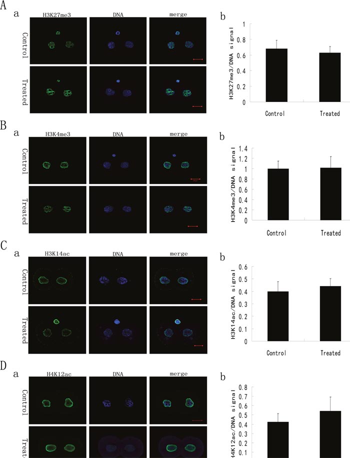 Figure 3: Histone modifications of the 2-cell stage embryos derived from ICSI using the sperm with or without LL+P+RNases-treatment. (A) H3K27me3 in 2-cell stage embryos derived from ICSI using the sperm with or without treatment (n = 20). The staining pattern of H3K27me3 in 2-cell stage embryos derived from ICSI using the sperm with or without treatment (a) and the ratio of H3K27me3/DNA signal intensity in 2-cell stage embryos derived from ICSI using the sperm with or without treatment (b). H3K27me3: green; DNA: blue. Bar=20μm. (B) H3K4me3 in 2-cell stage embryos derived from ICSI using the sperm with or without treatment (n = 18). The staining pattern of H3K4me3 in 2-cell stage embryos derived from ICSI using the sperm with or without treatment (a) and the ratio of H3K4me3/DNA signal intensity in 2-cell stage embryos derived from ICSI using the sperm with or without treatment (b). H3K4me3: green; DNA: blue. Bar=20μm. (C) H3K14ac in 2-cell stage embryos derived from ICSI using the sperm with or without treatment (n = 21). The staining pattern of H3K14ac in 2-cell stage embryos derived from ICSI using the sperm with or without treatment (a) and th ratio of H3K14ac/DNA signal intensity in 2-cell stage embryos derived from ICSI using the sperm with or without treatment (b). H3K14ac: green; DNA: blue. Bar=20μm. (D) H4K12ac in 2-cell stage embryos derived from ICSI using the sperm with or without treatment (n = 17). The staining pattern of H4K12ac in 2-cell stage embryos derived from ICSI using the sperm with or without treatment (a) and the ratio of H4K12ac/DNA signal intensity in 2-cell stage embryos derived from ICSI using the sperm with or without treatment (b). H4K12ac: green; DNA: blue. Bar=20μm.
