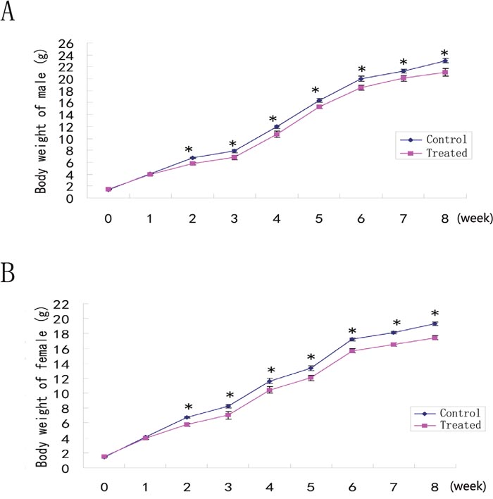Figure 4: The body weight trajectories of F1 males (A) and females (B). * P<0.05.