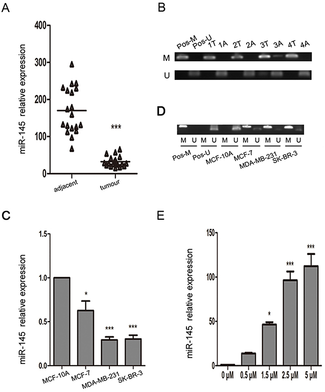 Figure 1: miR-145 is epigenetically downregulated in breast cancer clinical samples and cell lines. (A) Real-time PCR was used to analyze the expression of miR-145 in 19 breast cancer tissues paired with adjacent noncancerous tissues. (B) Methylation-specific PCR (MSP) was used to analyze the methylation state of the MIR145 promoter region in breast cancer clinical samples determined by MSP. Peripheral blood cell DNA was used as positive control for methylated gene (Pos-M), bisulfite-modified peripheral blood cell DNA as positive control for unmethylated gene (Pos-U), M, methylated gene; U, unmethylated gene; T, tumor tissue; A, adjacent tissue. (C) Real-time PCR was used to analyze the expression of miR-145 in breast cancer cell lines. The expression of miR-145 was significantly downregulated in the breast cancer cell lines MCF-7, MDA-MB-231, and SK-BR-3 compared with the normal breast cell line MCF-10A, with U6 as internal control. (D) MSP was used to analyze the methylation state of the MIR145 promoter region in breast cancer cell lines. (E) Real-time PCR was used to analyze the expression of miR-145 in MDA-MB-231 cells treated with different concentrations of 5-AzaC (0.5 μM, 1.5 μM, 2.5 μM, and 5 μM). All the assays were performed in triplicates, and the results are shown as the mean ± SD. Significance was determined by Student t-test (A), or one-way ANOVA with Bonferroni’s Multiple Comparison Test (C, E). *P < 0.05, ***P < 0.001.