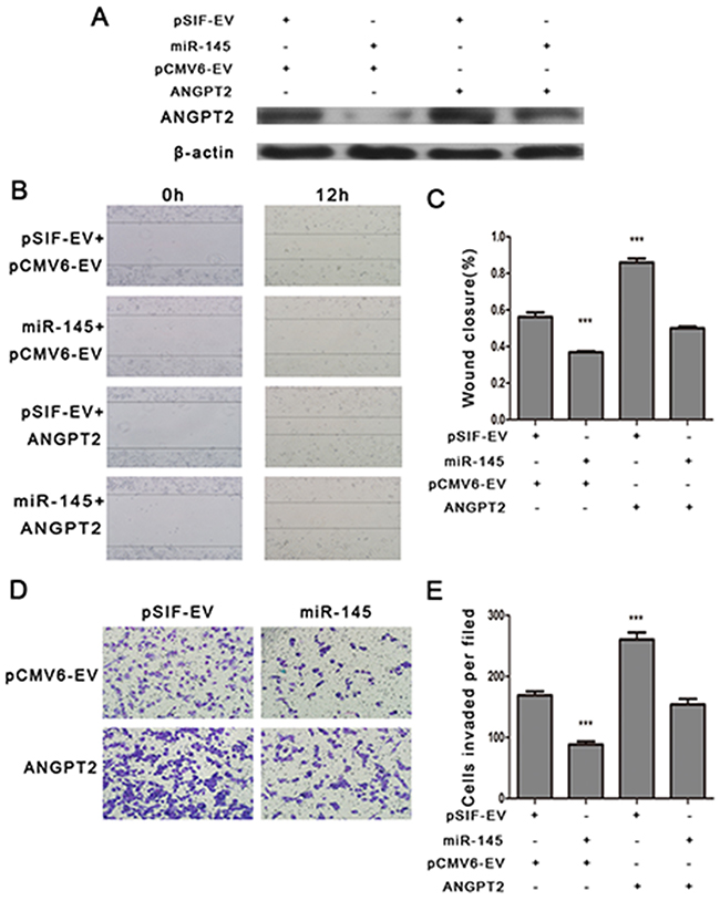 Figure 3: ANGPT2 re-expression attenuates miR-145 mediated inhibition of cell migration and invasion in MDA-MB-231 cells. (A) Western blot analyzing the expression of ANGPT2 in MDA-MB-231 cells with the co-transfection of pSIF–GFP or pSIF–GFP–miR-145 vectors together with either pCMV6-AC-GFP or pCMV6-AC-ANGPT2 vectors. (B) and (C) Wound healing assay, (D) and (E) transwell assays indicated that co-transfection of ANGPT2 with miR-145 profoundly promoted the cell migration and invasion compared with miR-145 transfection alone. All the assays were performed in triplicates, and the results shown as the mean ± SD. Statistical significance was determined by one-way ANOVA with Bonferroni’s Multiple Comparison Test (C, E). ***P < 0.001.