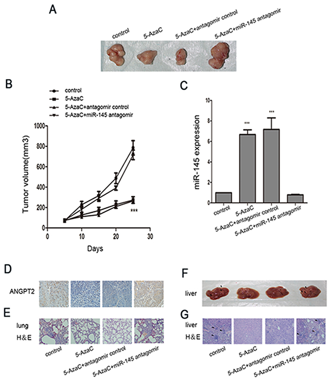 Figure 5: Treatment with 5-AzaC with or without miR-145 antagomir modulated invasion and metastasis in tumor-bearing nude mice. (A) Representative tumor images in nude mice seeded with MDA-MB-231 cells in the presence of 5-AzaC, 5-AzaC plus miR-145 antagomir, or 5-AzaC plus miR-145 antagomir control (n=6 for each group). (B) Time course of tumor growth in these groups. (C) The relative expression levels of miR-145 in nodules from each group. (D) Immunohistochemistry analysis of ANGPT2 expression in tumors from xenografted mice of the four groups (magnification 200×). (E) H&E staining of lungs in the four groups of xenografted mice (magnification 200×). (F) Nodules (arrowheads) on liver metastases in the four groups of xenografted mice. (G) H&E staining of livers in the four groups of xenografted mice (magnification 200×). All the assays were performed in triplicates, and the results are shown as the mean ± SD. Statistical significance was determined by one-way ANOVA with Bonferroni’s Multiple Comparison Test (B, C). ***P < 0.001.