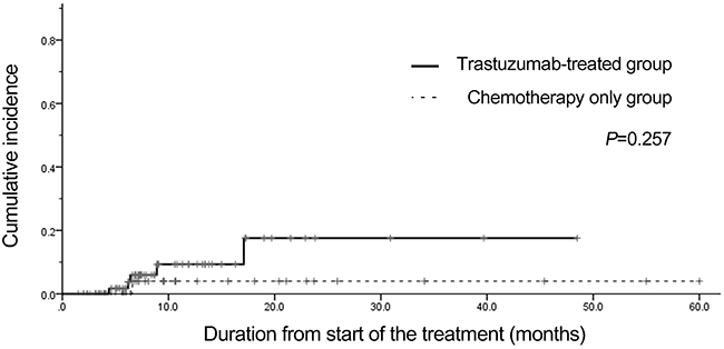The clinical differences between the groups that received first-line chemotherapy with or without HER2-targeted therapy were analyzed using the Chi-square, Fisher’s exact, and Mann-Whitney U tests. Cumulative incidences of cardiac dysfunction were compared using a Kaplan-Meier analysis. The incidence of cardiac dysfunction between each of the groups with different clinicopathological features was compared using logistic regression models. A P <0.05 was considered statistically significant. All statistical analyses were performed using IBM SPSS version 23.0 for Windows (IBM, Armonk, NY, USA).