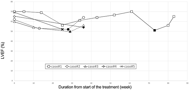 In gastric cancer, the Trastuzumab for Gastric Cancer (ToGA) trial investigated the efficacy of trastuzumab in HER2-positive metastatic gastric cancer patients. Though a low incidence of cardiotoxicity was found in this study (5% in the trastuzumab plus chemotherapy group and 1% in the chemotherapy group) [11], detailed profiles regarding LVEF in the treatment groups were not reported. Due to the lack of clinical trials and knowledge, the incidence and characteristics of cardiotoxicity related to trastuzumab in gastric cancer patients have not been clearly shown.