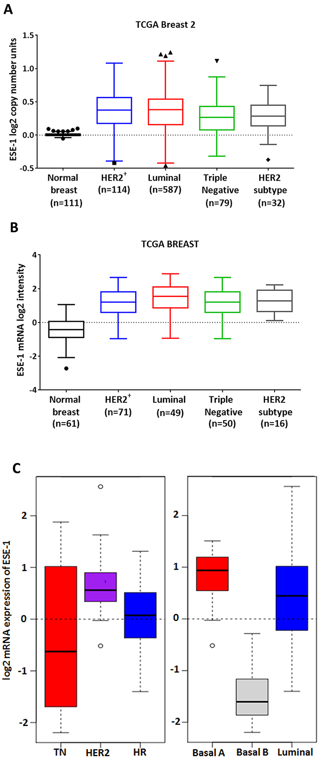Since the ESE-1 gene locus maps to chromosome 1q31.1, a region that is often amplified in breast cancer [16, 23], we first investigated ESE-1 copy number level between normal breast tissue and breast carcinoma subtypes using DNA data available from the TCGA Breast 2 cohort (generated by the TCGA Research Network: http://cancergenome.nih.gov/) in Oncomine [24]. We found a significant increase in the log2 ESE-1 copy number units between normal breast and cancer tissues, with luminal, HER2-enriched and triple negative cancer types showing a median 1.2-1.3-fold copy number increase (Anova P value <0.001) (Figure 1A). Given the strong correlation between the level of ESE-1 mRNA expression and copy number alterations (Supplementary Figure 1), we next determined whether ESE-1 mRNA log2 intensity varied between breast cancer subtypes compared to normal breast tissue using the TCGA Breast dataset from Oncomine [24]. Not surprisingly, we found that the median level of ESE-1 mRNA expression was 2.8- to 3.3-fold higher in cancer tissues compared to the normal (Anova P value <0.001) (Figure 1B). Notably Figure 1B also showed that ESE-1 expression in the HER2 subtype tumors were quite high translating to log2 values ranging from 0 to 2 at the least. Other tumor types including the HER2+, which consisted of both the HER2 subtype and the HER2+ luminal B tumors had low to high level of ESE-1 expression translating to log2 values ranging from -1 to 3.