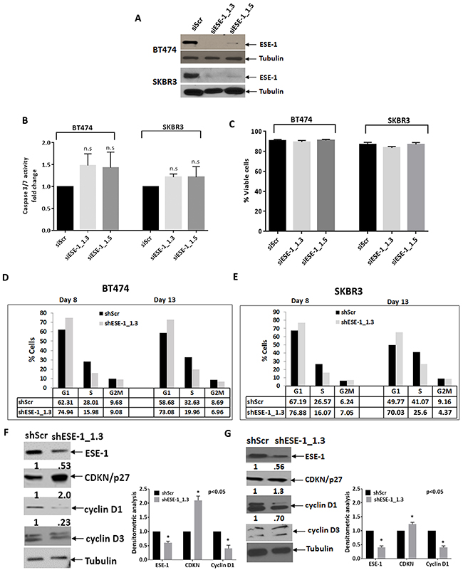 Figure 4: ESE-1 KD does not affect apoptosis but causes a delay in progression through G1. (A) A Western blot showing transient ESE-1 knockdown using siESE-1_1.3 and siESE-1_1.5 in BT474 and SKBR3 cells, 3 days post transfection. Transfection with siESE-1 (70 nM) almost completely inhibits ESE-1 expression. (B) Caspase 3/7 activity at day 3 post-transfection in BT474 and SKBR3 cells. The caspase 3/7 activity of the scramble control was set to 1, and that of the siESE-1 transfected cells were normalized to the scramble control value and expressed as fold change. There is no statistically significant difference between the knockdown and the control. In BT474 cells, the p values for the si-ESE-1_1.3=0.080 and for siESE-1_1.5=0.170 and in SKBR3 cells the p values for the si-ESE-1_1.3=0.148 and 0.427 for siESE-1_1.5. (C) Viability of the siESE-1 transfected BT474 and SKBR3 cells. Viability was measured by the trypan blue exclusion method using the Beckman coulter Vi-cell. (D) Cell cycle analyses of the DNA content were done on a synchronized cell population of BT474 cells. (E) Cell cycle analyses in SKBR3 cells were done on an unsynchronized cell population. Cell cycle analysis was performed, as detailed in Methods. The numbers on the Y axis represent the percent of cells at G1, S, and G2M for the knockdown and the scramble control, and are representative of three or more biological repeats. The cells were collected at 8 days and 13 days post transduction. The p-values were calculated using all three replicates (see Supplementary Figure and text). ESE-1 KD cells progress through the G1 slowly compared to the scramble controls. All p values were estimated from the results of 3 experiments. (E, F). Western blot with anti-cyclin D1, anti-cyclin D3, anti-p27kip1 on a portion of the cells collected at day 8.