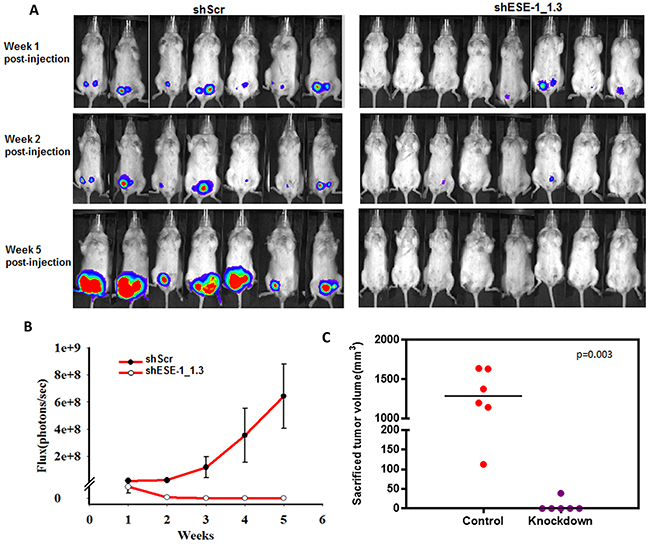 Figure 7: ESE-1 KD inhibits tumor formation in NOD/SCID female mice. (A) BT474 cells transduced with either shScr or shESE-1 were injected into mammary fat pads of NOD/SCID mice to establish tumor xenografts. Tumor growth is shown as IVIS signaling at weeks 1, 2 and 5 post injection. (B) Total photon flux from tumors derived from shScr control cells and derived from shESE-1 knocked down cells is shown over 5 weeks. (C) Sacrificed tumor sizes in shSchr control and shESE-1 knockdown groups. Tumors sizes were measured using the modified ellipsoid formula, Tumor volume = ½(length * width^2).