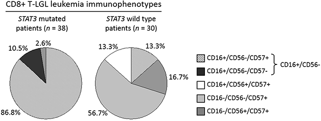 Figure 2: Immunophenotype distribution analysis evaluated in STAT3 mutated patients as compared with STAT3 wild type patients within CD8+ T-LGL leukemia. The graphs represent the incidence (%) of each LGL immunophenotype in the group of patients with STAT3 mutations (pie chart on the left) and in the group wild type for STAT3 gene (pie chart on the right). Mutated patients mostly belong to CD16+/CD56- phenotype (37/41, 90.2%), representing only 13.3% (4/30) of wild type patients’ group.