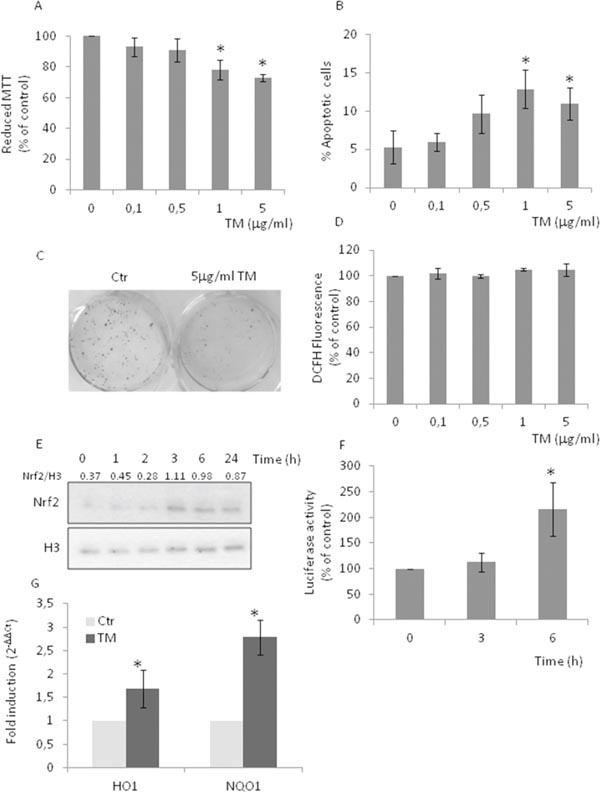 Figure 1: Tunicamycin causes Nrf2 activation in the absence of increased levels of ROS. PC3 cells were treated with increasing concentrations (0-5μg/ml) of TM for 24 h. (A) Cell viability as detected by MTT assay; (B) percentage of apoptotic cells as detected by PI staining and FACS analysis; (C) clonogenic assay, in the presence of 5μg/ml TM; (D) ROS levels as detected by DCFH fluorescence; (E) Nrf2 nuclear levels as detected by western blotting, histone H3 was used as loading control. (F) Nrf2 activation as detected by luciferase assay. Control values (mean ± S.D., n = 6) are given as 100%. (G) HO-1 and NQO-1 expression as determined by qPCR. Expression was normalised to GAPDH and reported as 2− ΔΔCt. Relative mRNA level of untreated cells was assumed to be 1. *p < 0.05 vs. control cells.