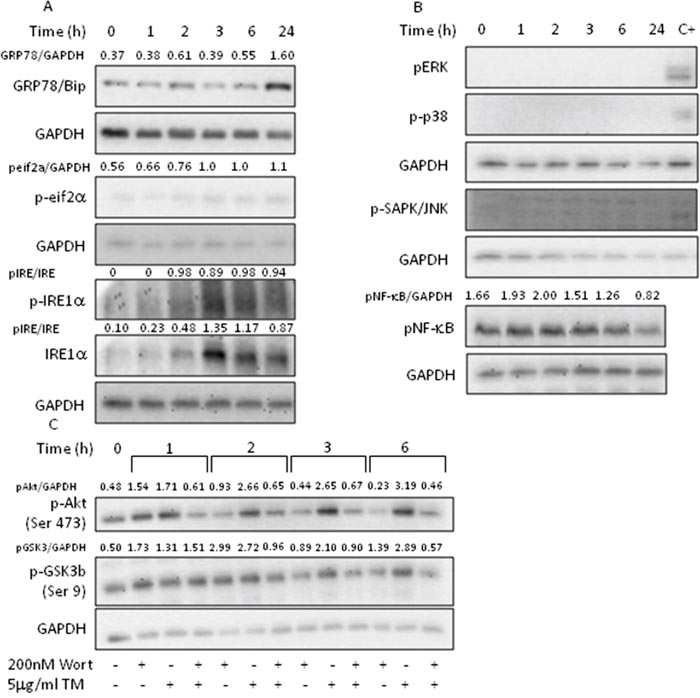 Figure 2: Tunicamycin activates AKT signaling. PC3 cells were treated with 5μg/ml TM for the indicated time, collected and total extract subjected to western blotting with the indicated antibodies. Wortmannin was added to cell culture 1h prior to TM treatment. (A) Analysis of UPR markers; (B) analysis of MAPK activation; (C) analysis of Akt pathway activation. GAPDH was used as loading control. One out of four independent experiments giving similar results is shown.