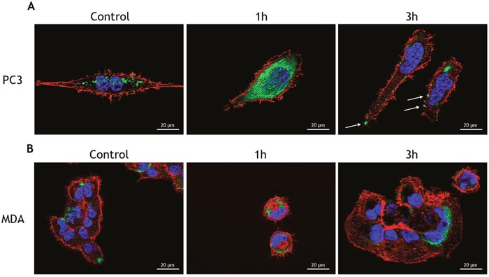Figure 3: Tunicamycin treatment induces the translocation of Bip to the cell surface. (A) PC3 cells and (B) MDAPCa2b cells were treated with 5μg/ml TM for the indicated times and used for detection of GRP78/BiP (green) by immunofluorescence. Cytoskeletal actin was visualized by AlexaFluor555-conjugated phalloidin staining (red) and nuclei were counterstained with DAPI (blue). Magnification: 63×.