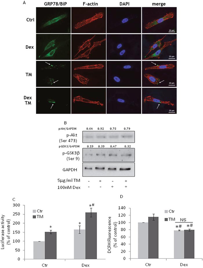 Figure 6: Dexamethasone treatment of PC3 cells does not affect GRP78/BiP translocation. (A) PC3 cells, treated with100nM Dexamethasone (Dex) for 72h, were exposed to 5μg/ml TM for 3h and used for detection of GRP78/BiP (green) by immunofluorescence. Cytoskeletal actin was visualized by AlexaFluor555-conjugated phalloidin staining (red) and nuclei were counterstained with DAPI (blue). Magnification: 63×. PC3 cells, after Dex treatment, were exposed to TM for 6h and used for (B) western blotting analyses with the indicated antibodies. GAPDH was used as loading control. One out of four independent experiments giving similar results is shown; (C) Nrf2 activation as detected by luciferase assay; (D) PC3 cells, after Dex treatment, were exposed to TM for 24h and ROS levels were detected by DCFH fluorescence; control values (mean ± S.D., n = 4) are given as 100%. *p < 0.05 vs. control cells; # p<0.05 vs. TM-treated cells.