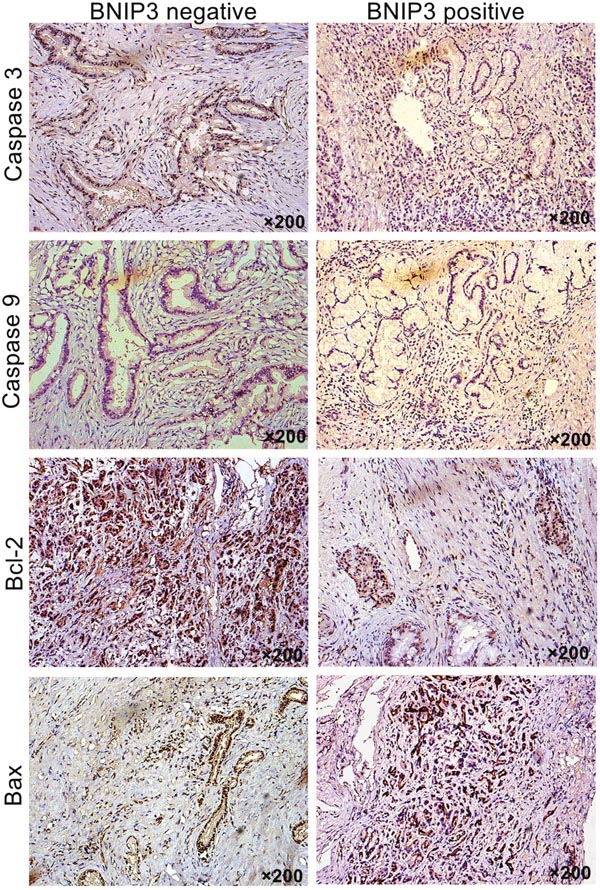 Figure 3: Correlation between BNIP3 expression and apoptosis-associated proteins. Expression of Bcl-2, Bax, caspase 3, and caspase 9 were examined via IHC. Original magnification: ×200.