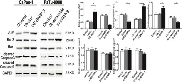 Figure 6: Correlation between BNIP3 and apoptosis-associated proteins in pancreatic cancer cells. The expression of apoptosis-associated proteins was examined by Western blot assays following overexpression and/or knockdown of BNIP3. The images are representative of three independent experiments. Data are presented as mean ± SD, *P < 0.05.