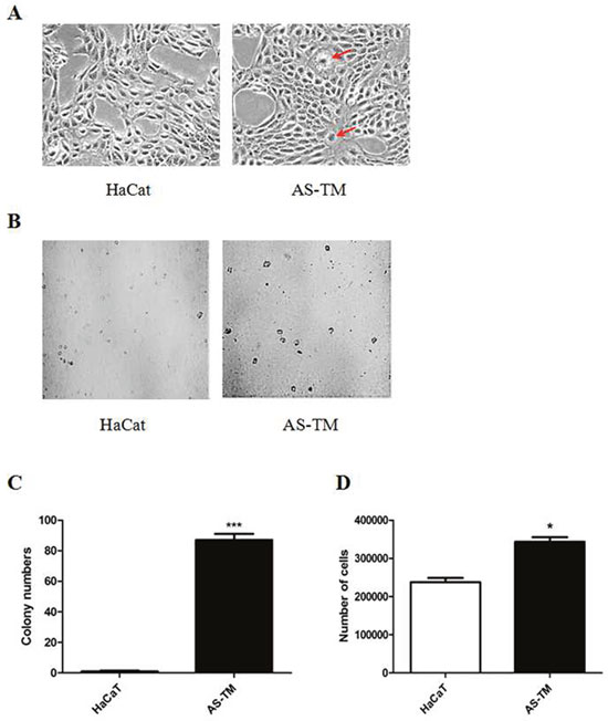 To achieve oncogenic transformation, HaCaT cells were continuously exposed to a low level (100 nM) of inorganic arsenite. After 28 weeks of continuous arsenic exposure, the arsenic-treated cells (AS-TM) exhibited unique morphological alterations with the frequent occurrence of giant multinuclear cells (Figure 1A), which are common during malignant transformation and in tumors [45]. The AS-TM cell proliferation was significantly promoted after malignant transformation, as shown in Figure 1D. Anchorage-independent growth is a characteristic of transformed cells [45]. To determine whether cells chronically exposed to arsenite acquired this capacity, anchorage-independent growth was examined and the results showed that HaCaT cells exposed to 100 nM sodium arsenic could undergo colony growth in agar compared with control cells (Figure 1B and 1C). Therefore, cells chronically exposed to this low level of arsenite acquired a malignant phenotype.