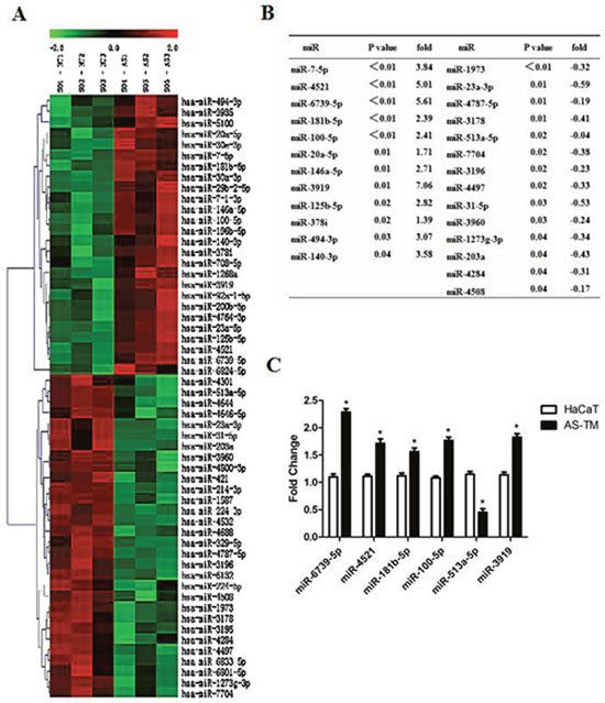 Figure 2: Arsenic exposure induced the differential expression of miRNAs. Total RNAs were extracted from arsenic-induced transformed cells and control cells, and miRNA array was performed for analysis. (A) Hierarchical clustering and heat map of the differential represented miRs in arsenite-treated cells. Gene tree representation (left) and heat maps (right) of miRNAs differentially regulated during arsenite treatment (T1, T2, T3 = control samples and AS1, AS2, AS3 = arsenite-treated samples) with a p value≤0.05. Each colored bar represents 1 probe set. Bar colors define the degree of expression (red = over-represented miRs; green = down-represented miRs). (B) List of differentially expressed miRNA in AS-TM cells. (C) Total RNAs were extracted from arsenic-induced transformed and control cells, and q-RT-PCR was performed to test the target gene expression as indicated. Relative expression levels of the six miRs in control (HaCaT) and arsenite-transformed (AS-TM) cells. Each bar represents the mean ± SEM of three independent replicates. *p value≤ 0.05.