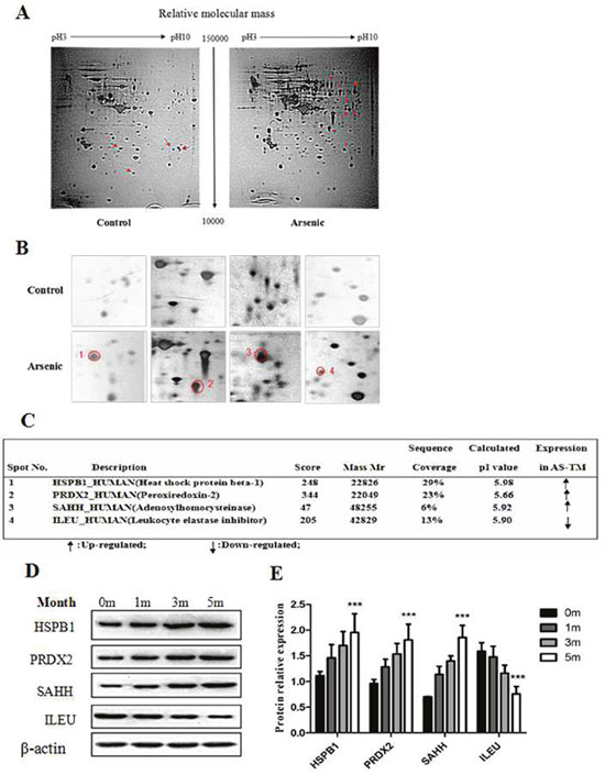 Figure 3: Comparative proteome analysis after arsenic treatment in HaCaT cells. HaCaT cells were continuously maintained in DMEM medium containing 100 nM of sodium arsenite for 28 weeks, and subsequently 2D-PAGE plus MS/MS were performed to analyze the protein expression profile. (A) Representative 2D gel profiles of total proteins (silver staining). The corresponding arrows show the differentially expressed protein spots, where the left four arrows are the up-regulated protein spots in the control group, and the right eight arrows are the up-regulated protein spots in the arsenic treated group. The details of 2-DE procedure are described in the Materials and Methods section. (B) Magnification shows the differentially expressed proteins. (C) The differential expression of protein spots was identified using mass spectrometry, and the MS/MS procedure is described as in the Materials and Methods section. (D) The protein levels of HSPB1, PRDX2, SAHH and ILEU were detected using Western blotting. Relative expression levels of HSPB1, PRDX2, SAHH and ILEU in control (0 month) and at different time points (1, 3 and 5 months) of arsenic treatment in HaCaT cells. (E) Histograms showing the relative fold-change of HSPB1, PRDX2, SAHH and ILEU protein (mean ± SEM of triplicates) using β-actin as a control for protein loading. ***p < 0.001 vs. Control.