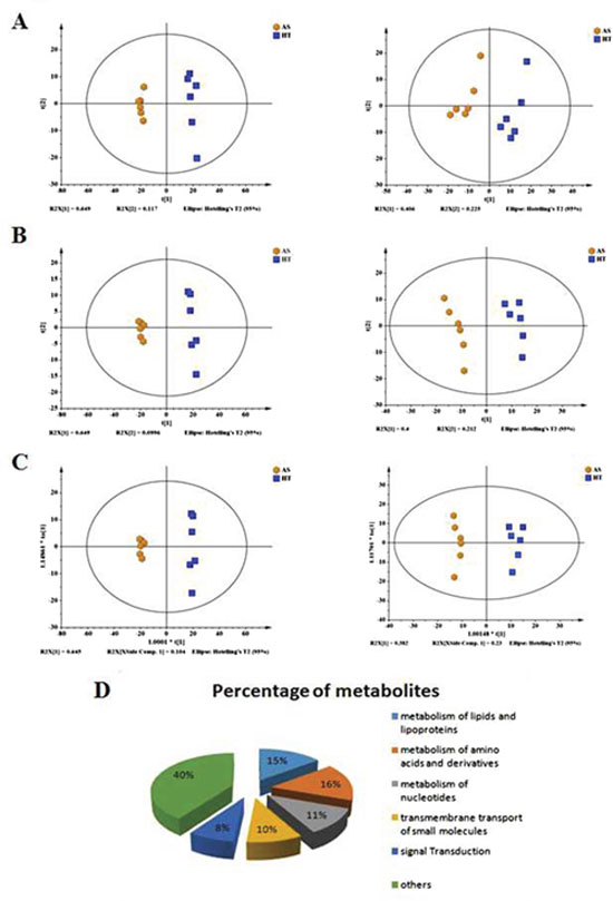 Figure 4: Scoring plots with PCA, PLS-DA and OPLS models of metabolites in control (HT, blue) and arsenic treatment (AS, yellow). (A) PCA for the positive model (Left panel); PCA for the negative model (Right panel). (B) PLS-DA for the positive model (Left panel); PLS-DA for the negative model (Right panel). (C) OPLS for the positive model (Left panel); OPLS for the negative model (Right panel). (D) The overview shows the differential metabolites in arsenic-induced transformed cells compared with control cells.