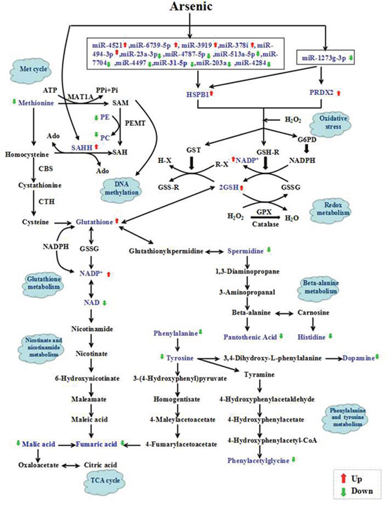 ‘Omics’ technologies, including microRNAome, proteomics and metabolomics, which provide information on global profile, are therefore regarded as powerful tools to investigate toxic responses to environmental pollutant exposure compared with conventional endpoint bioassays [33–35]. In addition, the integration of microRNAome, proteomics and metabolomics profiles may provide increased reliability in interpreting metabolic alterations resulting from certain genes or proteins, enabling further elucidation of the toxicological effects [36]. Although previous reports have addressed the effects of arsenic exposure on skin using high throughput technology [37–43], integrated microRNAome, proteomics and metabolomics profiles to study skin carcinogenesis induced by arsenic have not been reported.