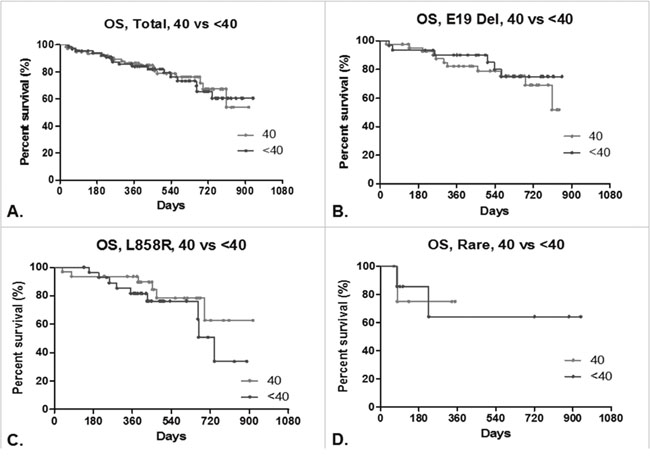 Figure 1: Overall survival (OS) of lung adenocarcinoma patients. Kaplan-Meier curves of OS in patients treated with afatinib: (A) total, 40 mg/day (N=79) vs. <40 mg/day (N=67). Median: undefined vs. undefined days, HR: 0.9320, 95% CI: 0.4792 to 1.813, p=0.8061. (B) Patients bearing the exon 19 deletion mutation, 40 mg/day (N=42) vs. <40 mg/day (N=31). Median: undefined vs. undefined days, HR: 1.369, 95% CI: 0.5242 to 3.578, p=0.6135. (C) Patients bearing the L858R mutation, 40 mg/day (N=32) vs. <40 mg/day (N=29). Median: undefined vs. 738 days, HR: 0.5570, 95% CI: 0.2089 to 1.594, p=0.2889. (D) Patients bearing other rare mutations of the EGFR, 40 mg/day (N=5) vs. <40 mg/day (N=7). Median: undefined vs. undefined days, HR: 0.8695, 95% CI: 0.08265 to 9.148, p=0.9073.