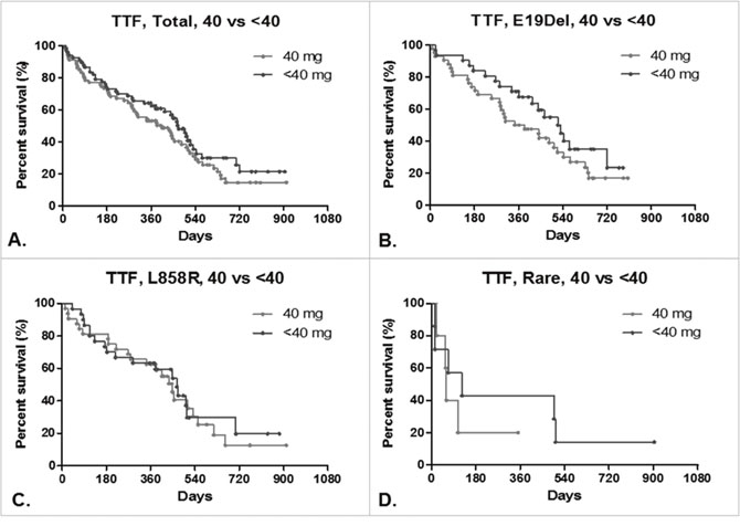 Figure 2: Time to treatment failure (TTF) of lung adenocarcinoma patients. Kaplan-Meier curves of TTF in patients treated with afatinib: (A) total, 40 mg/day (N=79) vs. <40 mg/day (N=67). Median: 405 vs. 472 days, HR: 1.294, 95% CI: 0.8712 to 1.921, p=0.2271. (B) Patients bearing the exon 19 deletion mutation, 40 mg/day (N=42) vs. <40 mg/day (N=31). Median: 364 vs. 519 days, HR: 1.518, 95% CI: 0.8698 to 2.650, p = 0.1045. (C) Patients bearing the L858R mutation, 40 mg/day (N=32) vs. <40 mg/day (N=29). Median: 466 vs. 447 days, HR: 1.113, 95% CI: 0.5954 to 2.079, P=0.8343. (D) Patients bearing other rare mutations of the EGFR, 40 mg/day (N=5) vs. <40 mg/day (N=7). Median: 60 vs. 124 days, HR: 1.729, 95% CI: 0.4026 to 7.426, p=0.6207.