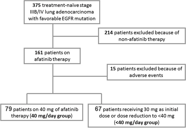 This was a retrospective analysis. The data were retrieved from a prospectively registered patient database, and all the patients were followed up according to the lung cancer protocols of Chang Gung Memorial Hospital (CGMH, No.5, Fu-Hsin Rd, Kuai-Shan Dist, Taoyuan City 33333, Taiwan, R.O.C.). More specifically, stage IIIB/IV lung adenocarcinoma patients treated at CGMH between May 2014 (2014/05/05) and December 2015 (2015/12/14) were recruited for this study. The CGMH Institutional Review Board approved and authorized this study (IRB No.201601389B0), which was conducted according to the ethical principles of the Declaration of Helsinki, the International Council for Harmonisation Good Clinical Practice, and the prevailing national regulations and guidelines. A total of 375 treatment-naive patients were selected for initial consideration. All of these patients had mutations in the EGFR that are known to be sensitive to TKIs. 214 of the patients were subsequently excluded owing to the prescription of therapies other than afatinib, while 161 patients were treated with an afatinib regimen. A subset of 15 patients from this group was ultimately excluded due to their experience of severe adverse events resulting from their afatinib therapy, which caused the afatinib treatment to be halted within 30 days without any chest imaging of tumor progression being recorded. Of the remaining cohort of 146 patients, 79 patients were treated with a 40 mg/day dosage of afatinib throughout the treatment period or before the data collection cutoff date of 30 Nov 2016, while 67 patients were treated with a <40 mg/day dosage, with the patients in both groups receiving their doses orally in the form of a pill. In clinical practice, the decision to provide a dose of 40 mg/day or <40 mg/day of afatinib depended on the results of discussions between the patients and their physicians. Usually, if a patient expressed particular concern about the potential for diarrhea or skin-related side effects, the physician would prescribe an initial dose of <40 mg/day of afatinib (i.e., 30 mg/day). Alternatively, if the patient received 40 mg/day of afatinib initially and then later suffered from adverse events that were poorly tolerated, the physician would de-escalate the dose to <40 mg/day during the later period of treatment. More specifically, if the original dose of 40 mg/day was not tolerated, it was reduced by 10 mg/day by changing to a different strength tablet or adjusting the dosing interval. In the <40 mg/day group, 18 patients used 30 mg/day as a starting dose; subsequently, 2 of them escalated their dose to 40 mg/day based on their physician’s clinical judgment, and 1 of them down-titrated the dose to 20 mg/day. Forty-nine of the patients in the <40 mg/day group took 40 mg/day as their initial dose, and all of them subsequently reduced their dose to 30 mg/day due to side effects, after which only 2 of them required a further dose reduction to 20 mg/day. Figure 3 summarizes the process for the inclusion of patients in the study.