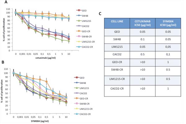 Figure 1: Effects of cetuximab or SYM004 treatment on cell proliferation in a panel of human CRC cell lines. (A-B) Cells were treated with different concentrations of cetuximab (range, 0.001 to 10 μg/ml) and SYM004 (range, 0.001 to 10 μg/ml) for 96 hours and evaluated for proliferation by MTT staining, as described in Materials and Methods. (C) The IC50 was determined by interpolation from the dose-response curves. Results represent the median of three separate experiments, each performed in quadruplicate.