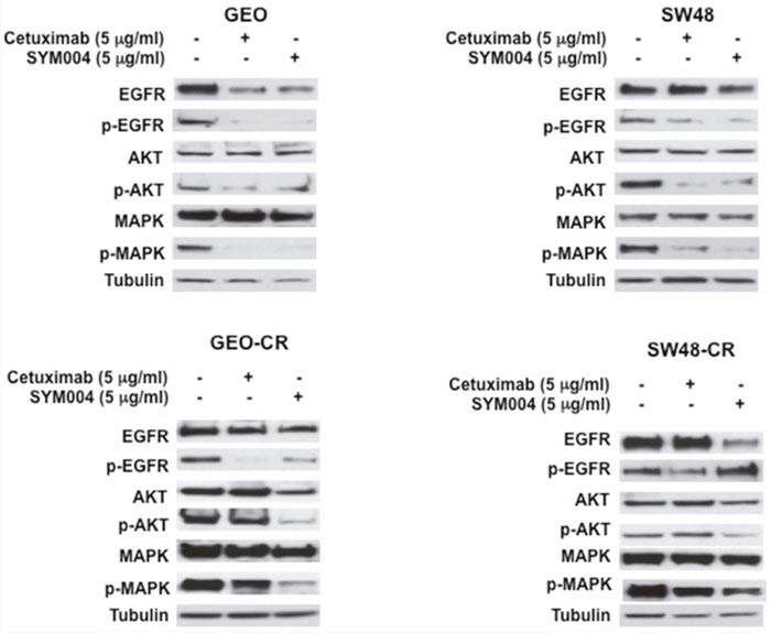 Further, to determinate the effect of these mAbs on EGFR and its downstream signaling pathway, we have selected two cetuximab-resistant cancer cells (GEO-CR and SW48-CR) and their parental cell lines. Western blot analysis revealed that the level of EGFR decreased in all four SYM004 treated cells, whereas no decrease in EGFR levels was seen in cells treated with cetuximab. The cetuximab treatment resulted in inhibition of phosphorylated MAPK and AKT proteins only in the cetuximab-sensitive cell lines, whereas no reduction was observed in the cetuximab-resistant cells (Figure 3). On the contrary, the anti-proliferative activity of SYM004 was coupled by inhibition of MAPK and AKT phosphorylation in all four cancer cell lines (Figure 3). All these findings suggested that SYM004 could overcome resistance to anti-EGFR treatment by inhibiting PIK3CA/AKT and MAPK pathways in CRC cancer cells with acquired resistance to cetuximab.