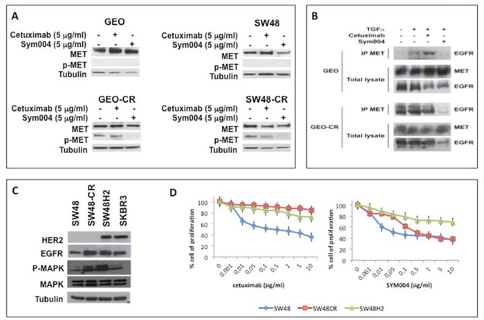 Figure 4: Effects of cetuximab or SYM004 in human colorectal cancer cell lines with acquired resistance to cetuximab such as MET activation and ERBB2 amplification. (A) Western blot analysis of protein expression in GEO, SW48, GEO-CR and SW48-CR cells treated with cetuximab (5 μg/ml) and SYM004 (5 μg/ml) was performed. Total cell protein extracts were subjected to immuneblotting with the indicated antibodies, as described in Materials and Methods. (B) Two mg of GEO cell or of GEO-CR cell protein extracts were immune-precipitated with a specific anti-MET antibody and then were immune-blotted with a specific anti-EGFR antibody, as described in Materials and Methods. (C) Western blot analysis of protein expression in SW48, SW48-CR, SW48H2 and SKBR3 was performed. Total cell protein extracts were subjected to immuneblotting with the indicated antibodies, as described in Materials and Methods. (D) HER2 gene amplified SW48 cells line (SW48H2) are exposed to different concentration of cetuximab (range, 0.001 to 10 μg/ml) and SYM004 (range, 0.001 to 10 μg/ml) for 96 hours and evaluated for proliferation by MTT staining, as described in Materials and Methods.