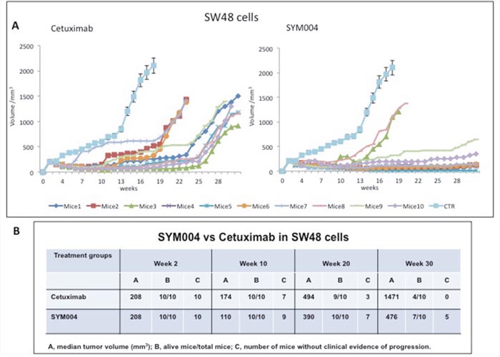 In the current work the activity of SYM004 was further explored in in vivo CRC models of acquired resistance to cetuximab. Nude mice were subcutaneously injected with SW48, LIM1215 or CACO2 cell lines and were randomly assigned to receive vehicle, cetuximab or SYM004 for 30 weeks. SYM004 demonstrated a stronger antitumor activity and prolonged effect in these CRC models resulting in significantly smaller tumor volumes as compared to cetuximab treated mice. After 10 weeks of treatment, evidence of clinical progression was evident in only one (for SW48 and LIM1215 xenografts) or two (for CACO2 xenografts) out of ten mice in SYM004 treatment group. On the contrary, in the cetuximab treatment group, the evidence of the clinical progression was evident in five out of ten mice (for LIM1215 and CACO2 xenografts) and in three out of ten mice (for SW48 xenografts). At week 30 the prolonged effect of SYM004 was more pronounced. Interestingly, in SYM004 treatment group five SW48 xenograft mices, six LIM1215 xenograft mices and seven CACO2 xenograft mices were still responding to the treatment. In contrast, in the cetuximab treated group all mice showed progression of disease except for the CACO2 xenografts, in which one out of ten mice was still responding to the treatment.