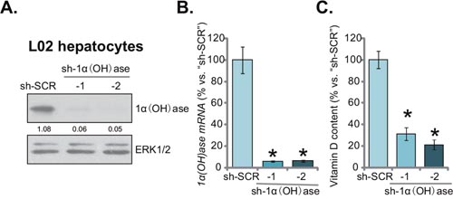 Figure 1: Knockdown of 1α(OH)ase leads to vitamin D3 depletion in L02 hepatocytes. Puromycin-selected stable L02 hepatocytes, expressing shRNA against human 1α-Hydroxylase [“sh-1α(OH)ase-1/-2”] or the scramble control shRNA (“sh-SCR”), were subjected to Western blotting assay (A) and qRT-PCR assay (B) to test 1α(OH)ase expression; Vitamin D3 content in the conditional medium was also analyzed (C). Relative 1α(OH)ase expression (vs. loading control ERK1/2) was quantified (A). Data were expressed as mean ± SD (n=5). * p <0.05 vs. “sh-SCR” cells. Experiments in this and all following figures were repeated three times, and similar results were obtained.