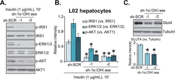 Figure 2: Knockdown of 1α(OH)ase leads to insulin resistance in L02 hepatocytes. Puromycin-selected stable L02 hepatocytes, expressing shRNA against human 1α-Hydroxylase [“sh-1α(OH)ase-1/-2”] or the scramble control shRNA (“sh-SCR”), were treated with insulin (1 μg/mL) for 10 min, expressions of listed proteins were tested by Western blotting assay (A); quantified results summarizing three sets of repeated blot data were also shown (B); expressions of GLUT4 and (β-) tubulin were also tested, results were also quantified (C). Data were expressed as mean ± SD (n=3). * p <0.05 vs. “sh-SCR” cells.