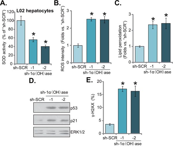 Figure 3: Knockdown of 1α(OH)ase leads to ROS production, p53-p21 activation and DNA damage in L02 hepatocytes. Puromycin-selected stable L02 hepatocytes, expressing shRNA against human 1α-Hydroxylase [“sh-1α(OH)ase-1/-2”] or the scramble control shRNA (“sh-SCR”), were subjected to listed assays to test SOD activity (A), ROS content (DCFH-DA assay) (B), lipid peroxidation level (TBAR assay) (C), p53-p21 signaling (Western blotting assay) (D), and DNA damage (γ-H2AX FACS assay) (E). Data were expressed as mean ± SD (n=5). * p <0.05 vs. “sh-SCR” cells.