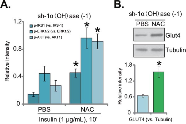 Figure 5: NAC restores insulin sensitivity in 1α(OH)ase-silenced L02 hepatocytes. L02 hepatocytes, infected with shRNA against human 1α-Hydroxylase [“sh-1α(OH)ase-1”], were also exposed to n-acetylcysteine (NAC, 500 μM, renewed daily) or PBS; After 10 days, cells were treated with insulin (1 μg/mL) for 10 min, expressions of listed proteins were tested by Western blotting assay, and results of three sets of repeats were quantified (A); expressions of GLUT4 and tubulin were also tested. (B) Quantified results summarizing three sets of repeated blot data were also shown). Data were expressed as mean ± SD (n=3). * p <0.05 vs. “PBS” cells.