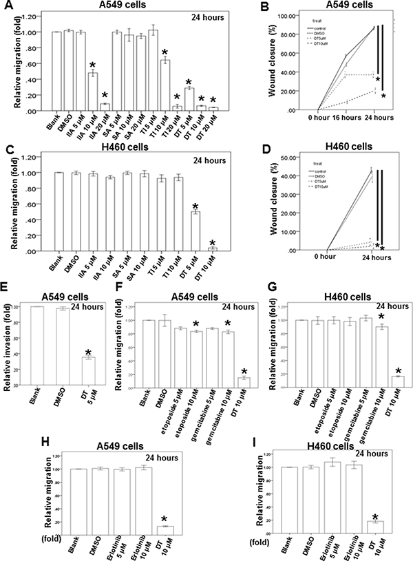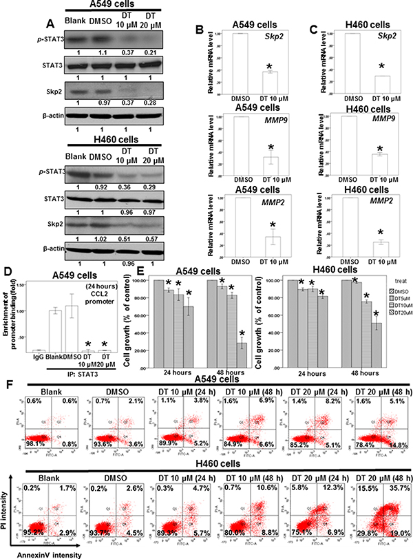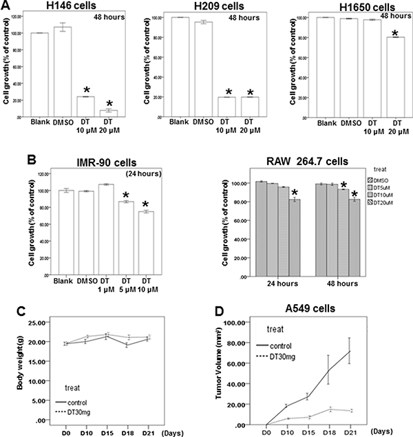 Mouse xenograft model were performed as described previously [82]. All procedures involving animals were approved by Animal Care and Use Committee (Approval number 2015060201) of Chang Gung Memory Hospital. Surgery was performed using sodium pentobarbital anesthesia. 10 male BALB/c-nu nude mice (18–20 g) aged 5–7 weeks were obtained from BioLASCO Taiwan Co., Ltd. and were used to build the model. A549 cells were injected (1 × 106/Mouse) subcutaneously in the left and right flanks of nude mice. Two days after, mice were randomized into 2 groups, 5 mice per each group and treated intraperitoneally with vehicle (2.5% DMSO) or with 30 mg/kg DT every 2 days. Tumor volume and mouse weight were measured every 3–5 days for 3 weeks. Tumor sizes were measured and tumor volume were calculated using the formula length × width × height × 0.52. Tumor size, body weight, and mortality of the mice were monitored daily. Following 3 weeks, the mice were sacrificed.