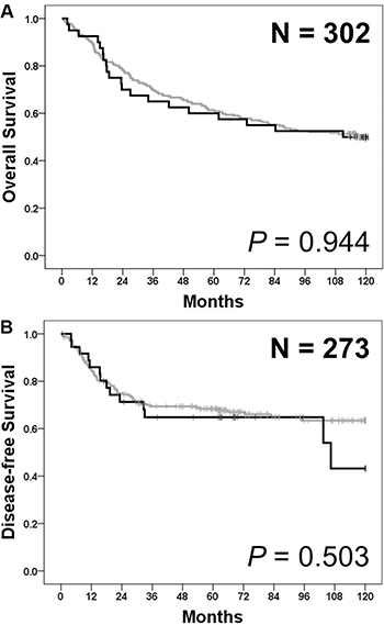 Statistical analysis of categorical variables was performed using Pearson’s chi-square test, Fisher’s exact test, or linear-by-linear association, as appropriate. Median DFS and OS were calculated using Kaplan–Meier method. Survival data were compared using log rank test. All the statistical tests were two-sided, with level of significance defined at p < 0.05. All the analyses were performed using IBM SPSS version 22.0 (IBM, Armonk, NY, USA).